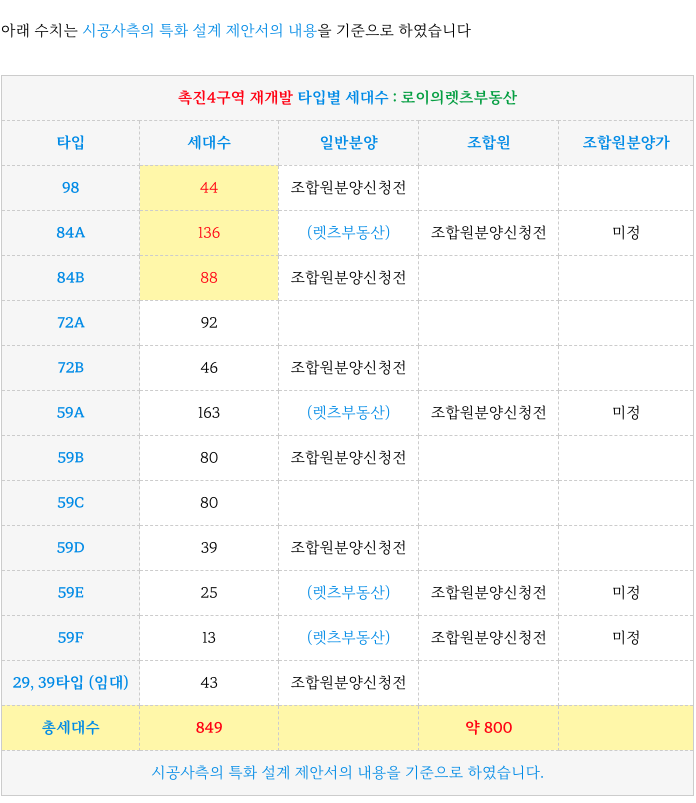 시민공원 촉진4구역 재개발의 각 타입별 세대수 입니다.