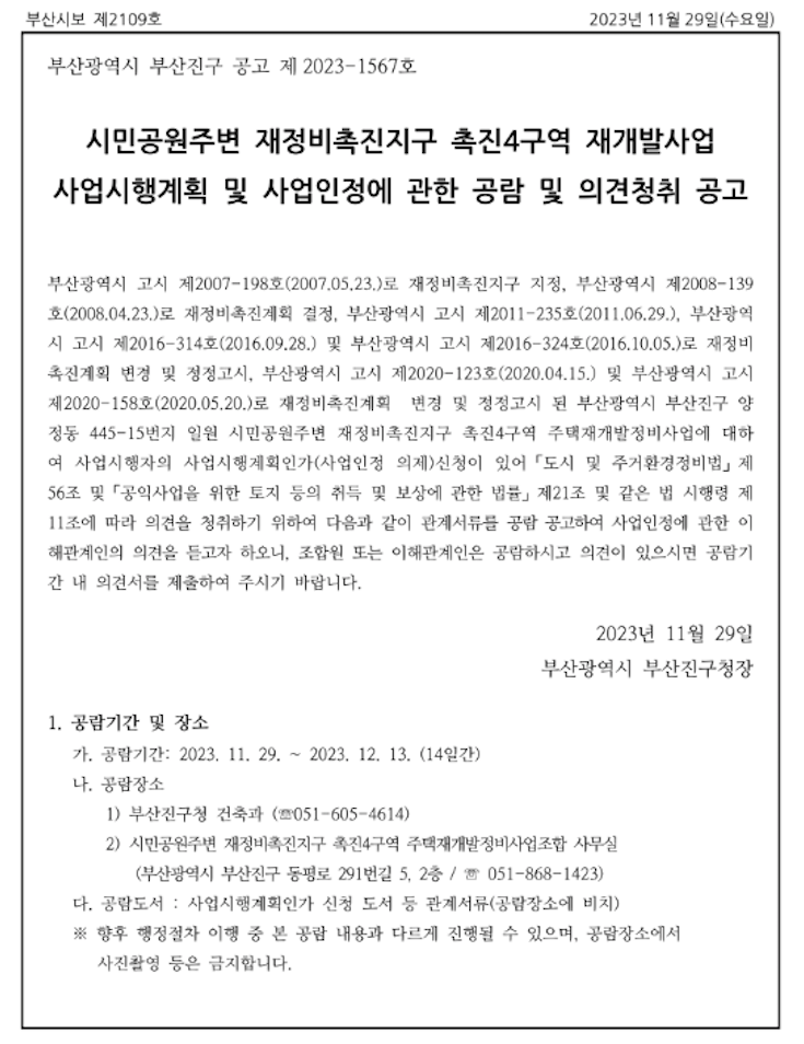 시민공원 촉진4구역 재개발은 이제 사업시행계획인가 고시를 바로 앞두고 있습니다.