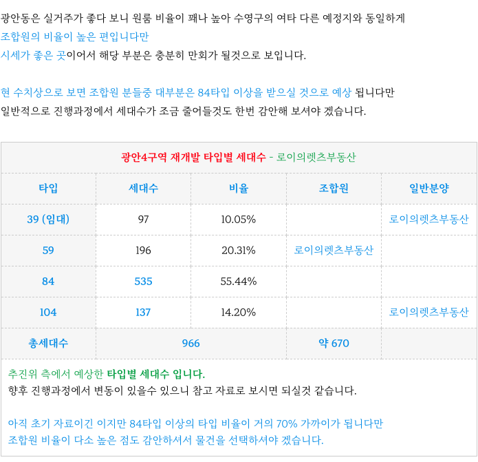 광안4구역 재개발 예상 타입별 세대수 입니다.