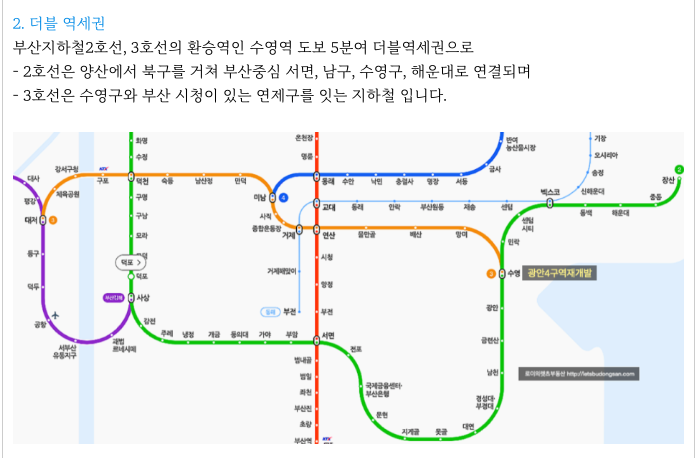 2호선, 3호선의 환승센터인 수영역 도보 3분여 더블 역세권 으로의