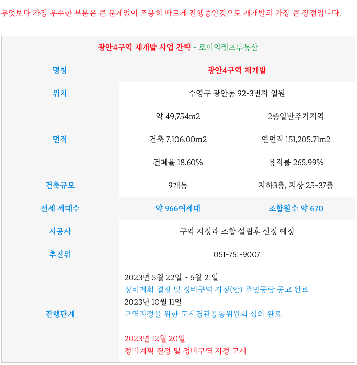 광안4구역 재개발 의 간략한 특징을 다시 한번 정리 하였습니다.