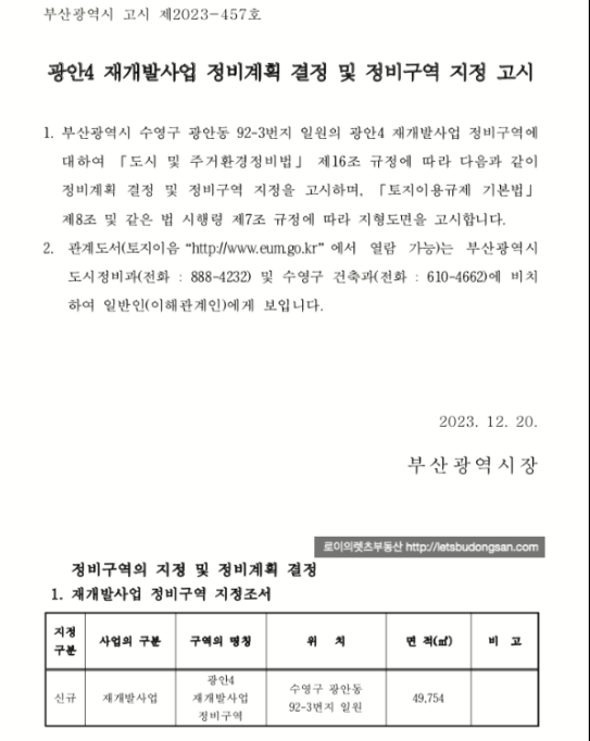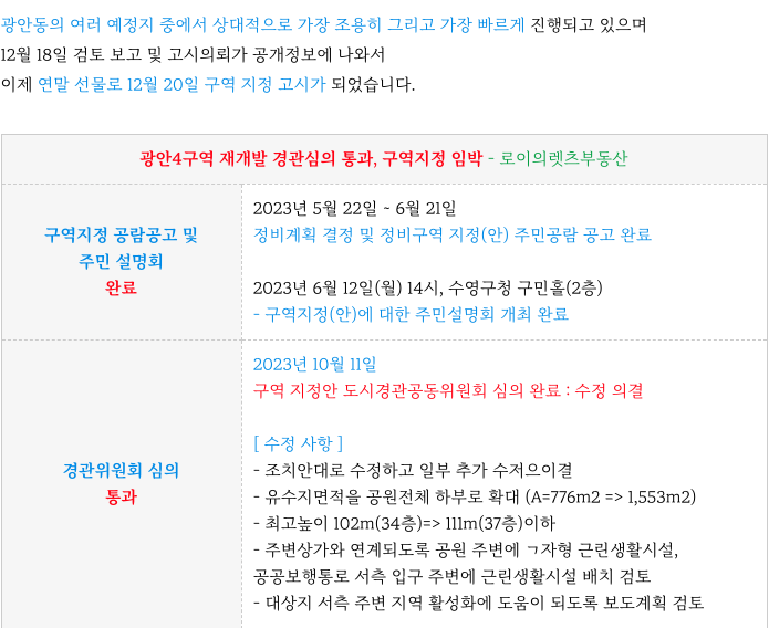 광안4구역 재개발 예정지 는 구역 지정 고시가 의뢰 되어 20일 고시 지정 되었습니다.