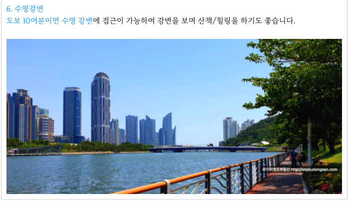 도보 10~20여분이면 수영 강변에 접근이 가능하여 강변을 보며 산책/힐링을 하기도 좋습니다.