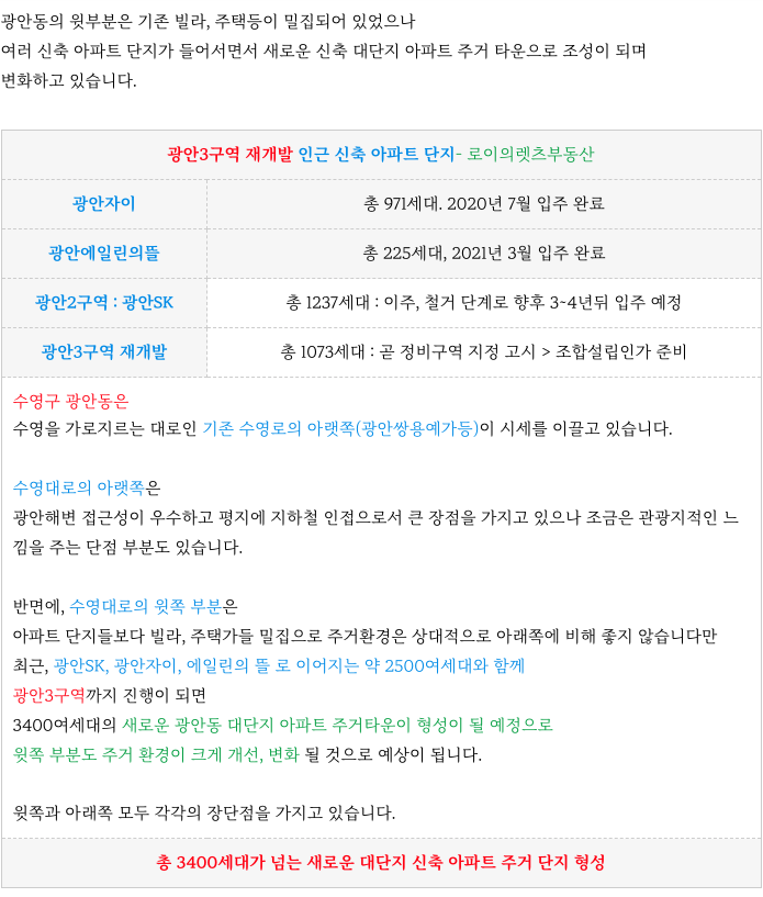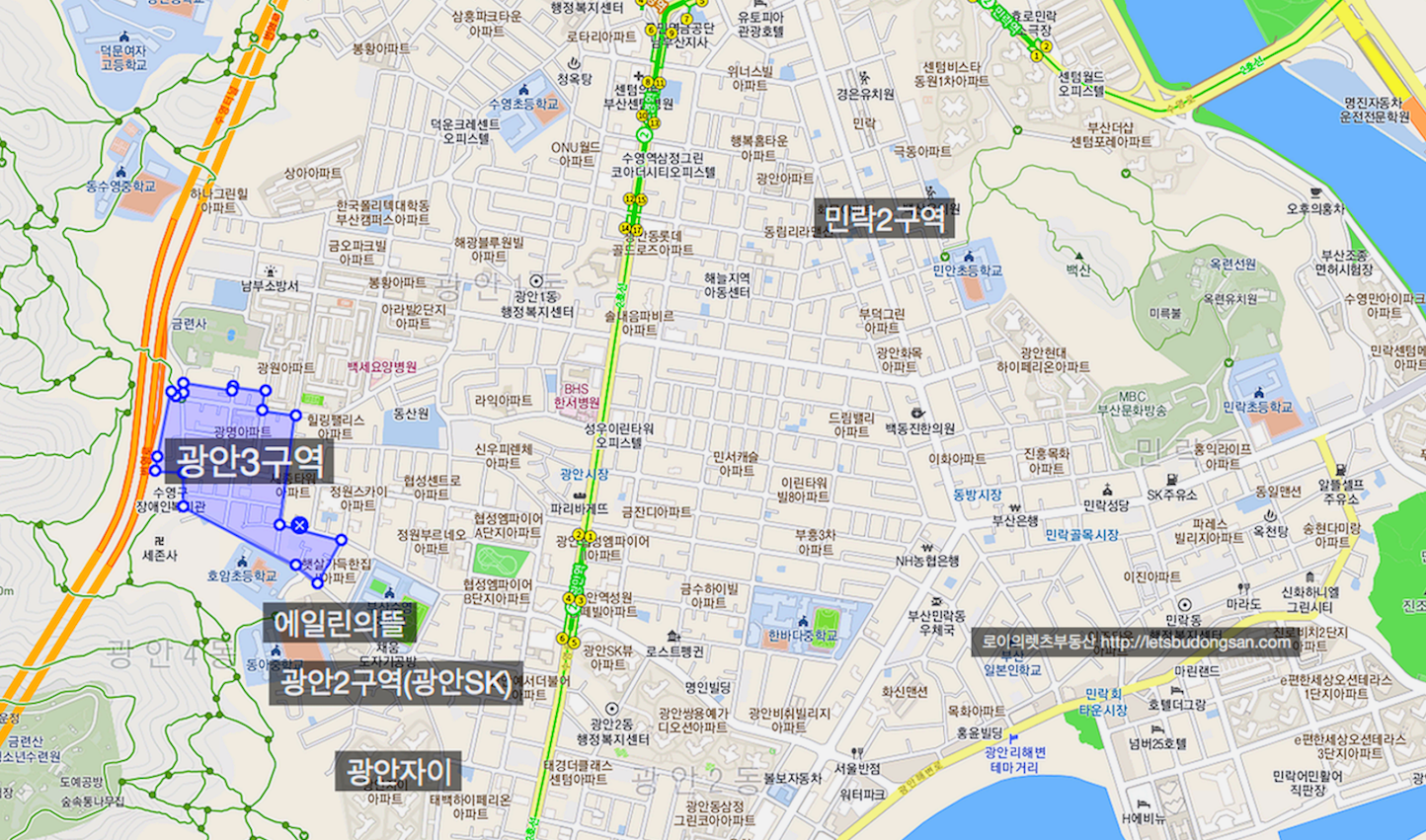수영구 광안3구역 재개발 이 위치한 광안동의 주변 상황을 정리해 드리겠습니다.