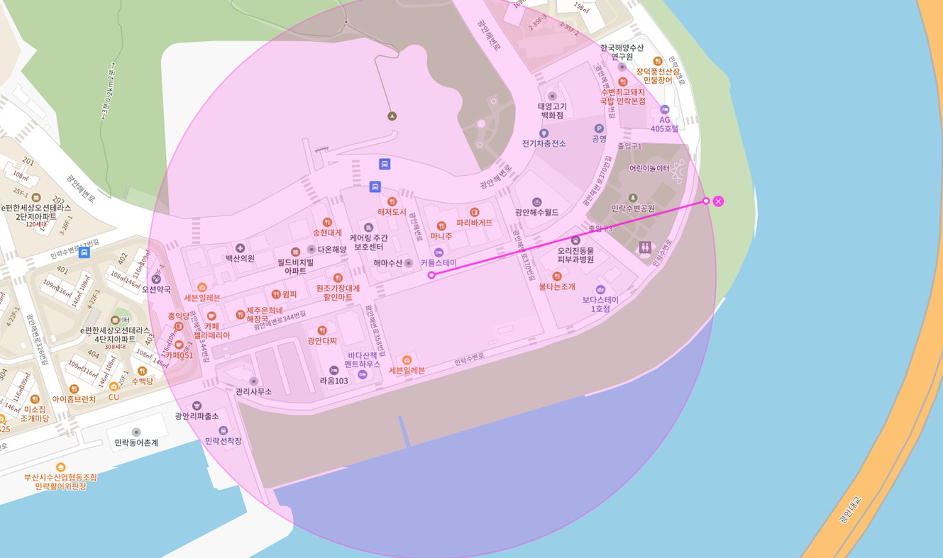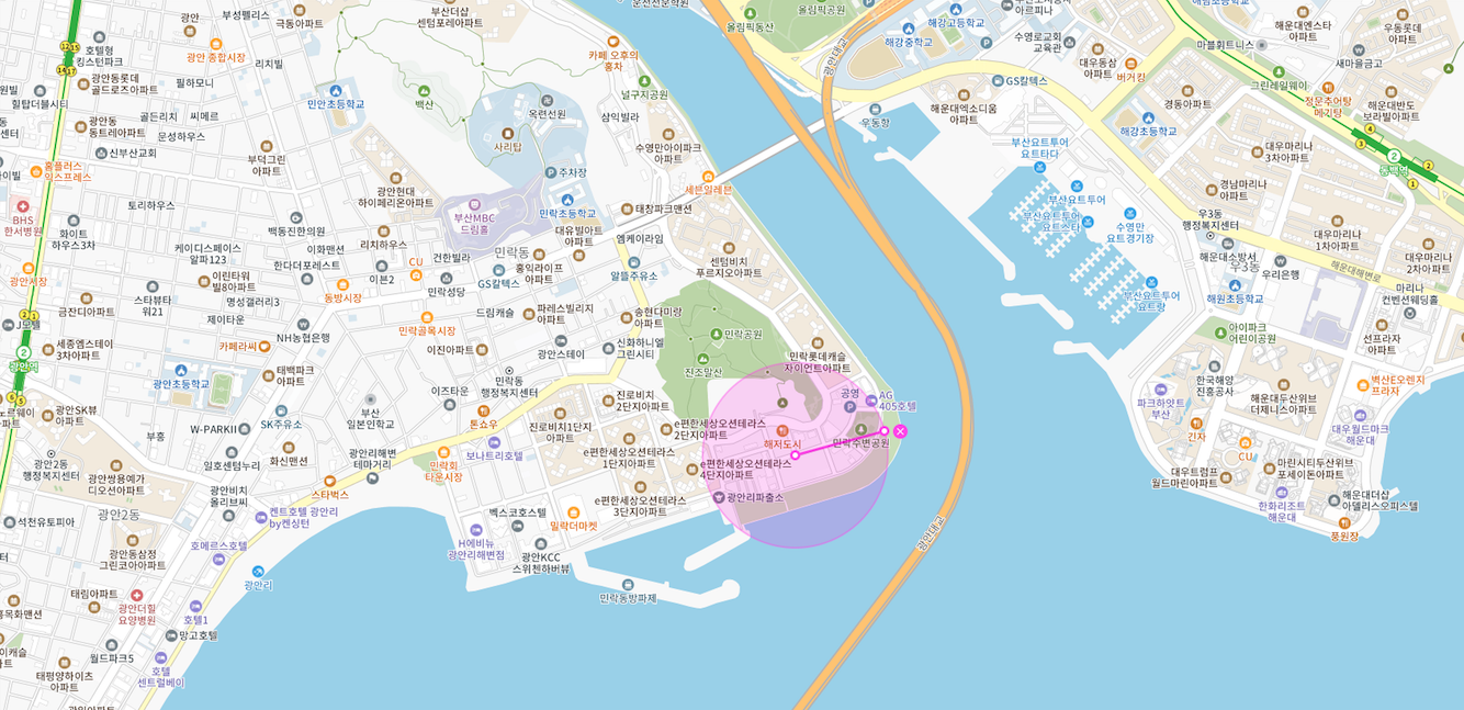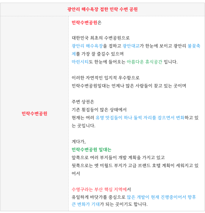 큰 변화가 진행중인 광안리 해수욕장 접한 민락 수변 공원애 위치한 상가 건물 입니다.