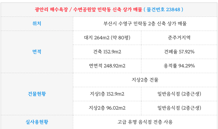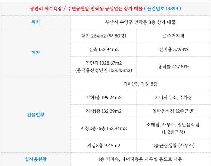 광안리해수욕장 / 민락동 수변공원 앞 상가 건물 매매 물건을 소개해 드리겠습니다.