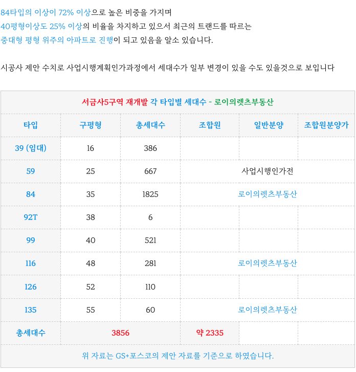 서금사5구역 재개발의 각 타입별 세대수 입니다.