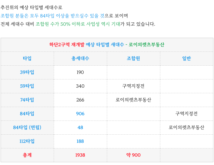 하단2구역 재개발 현 추진위의 예상 타입별 세대수 입니다.