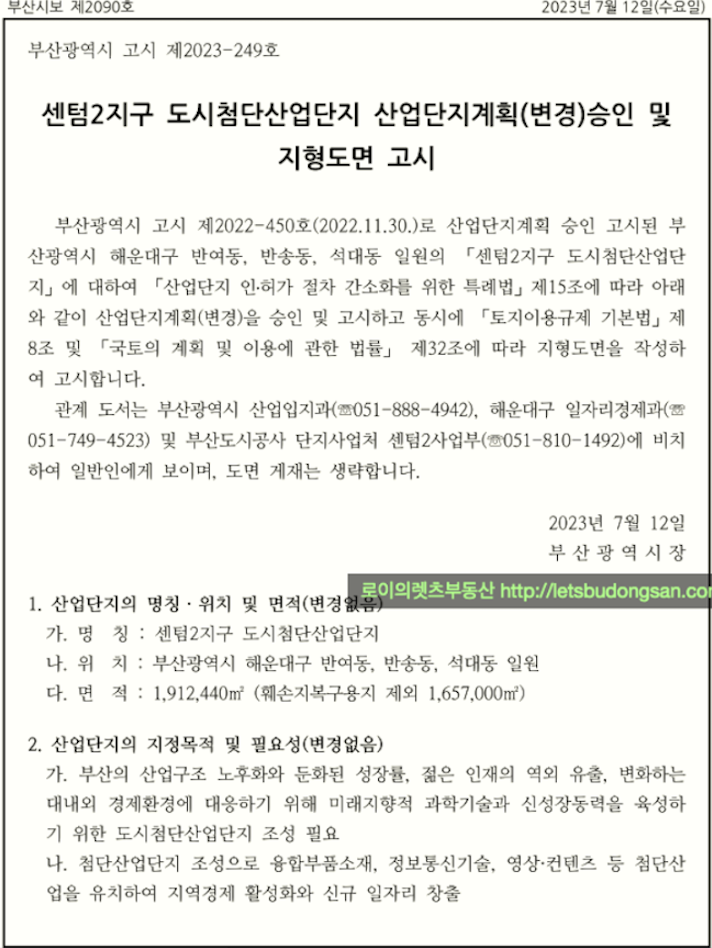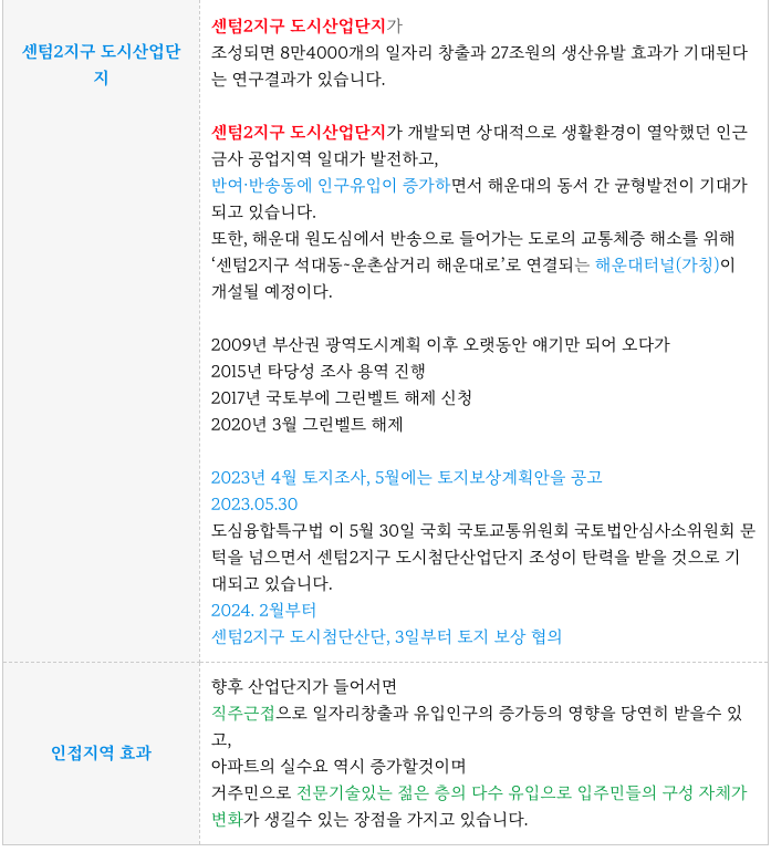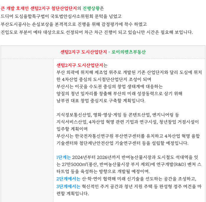 센텀2지구 도시산업단지의 내용을 간략히 정리하여 드립니다.