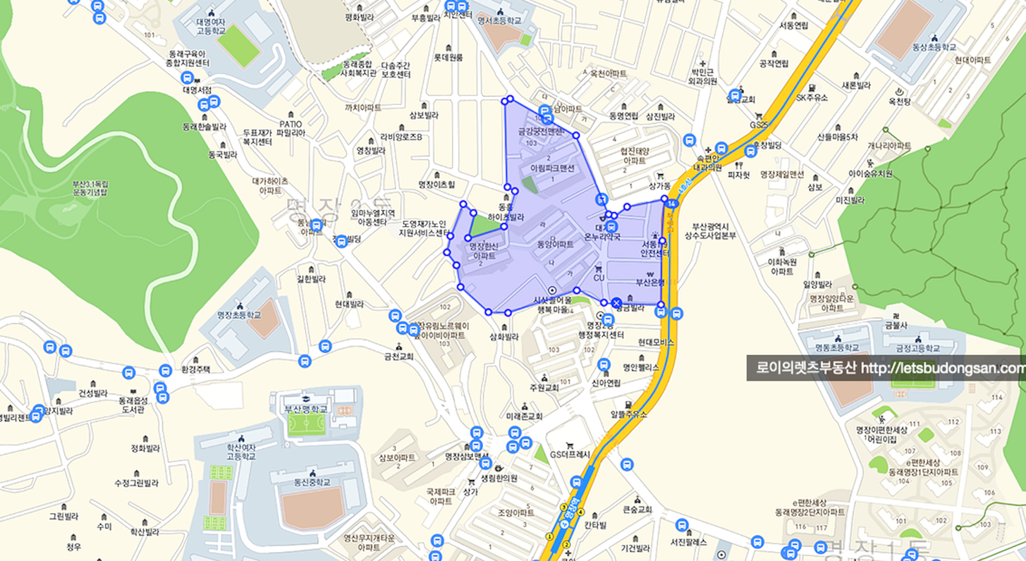 바로 왼쪽편으로 명장3구역 재개발 예정지, 그리고 윗쪽으로 명서1구역 재개발 예정지가 있어