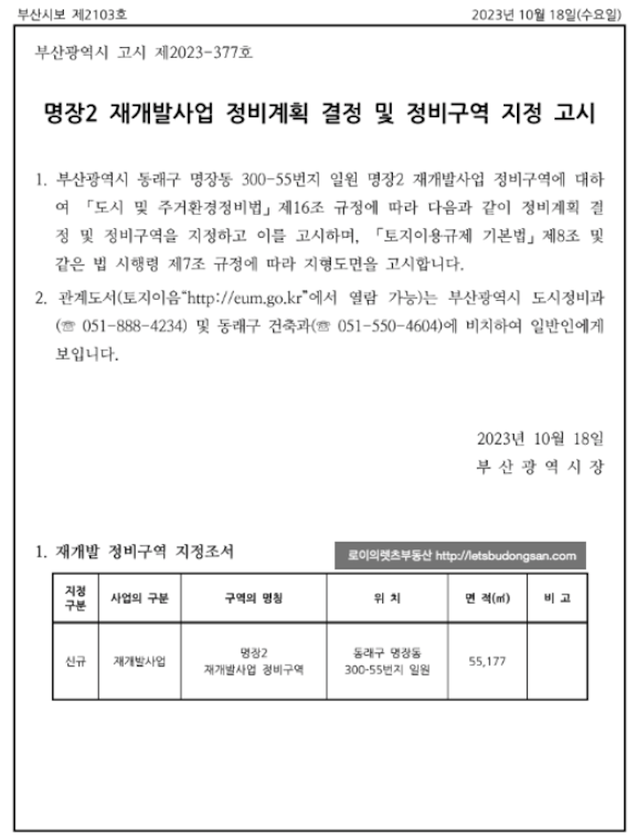 동래구 명장2구역 재개발 은 2023년 10월 정비구역 지정고시가 되었습니다.