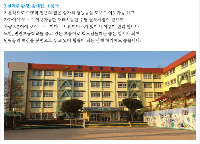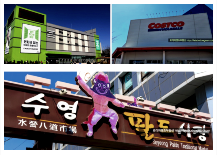 - 팔도시장, 수영역의 많은 상가, 병원, 인근 트레이더스, 코스트코, 신세계백화점