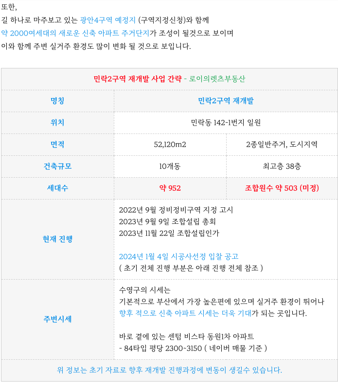 민락2구역 재개발 특징을 간락히 다시 정리하였습니다.