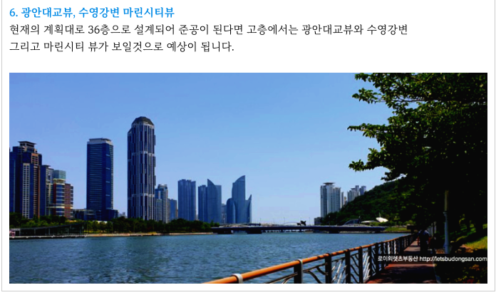- 더블역세권, 초품아, 숲세권, 수영 강변, 센텀생활권, 빠른진행