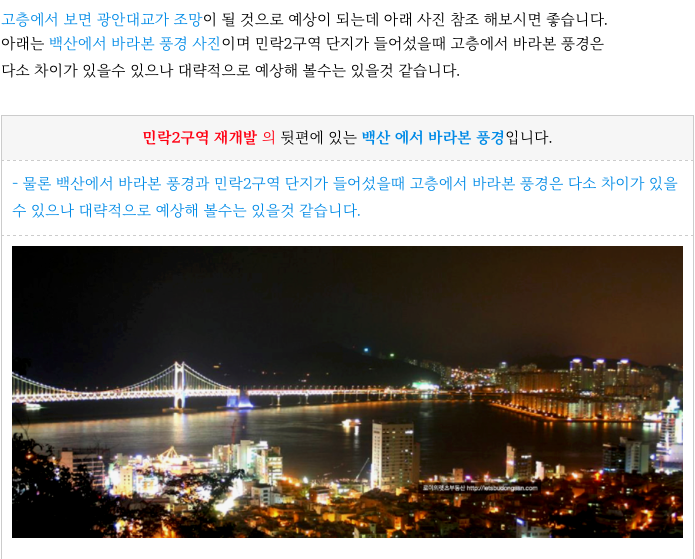 민락2구역 재개발의 광안대교 등 향후 예상 조망 부분 입니다.