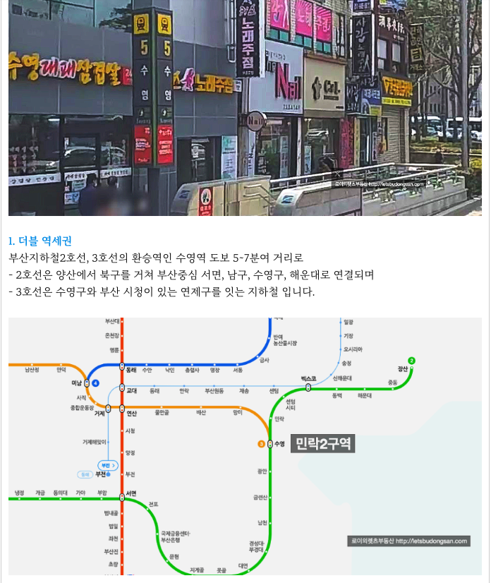 수영역 도보 5~7분여 거리에 위치한 역세권 에 위치하고 있으며