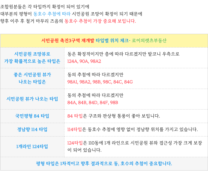 촉진3구역 재개발 의 시민공원 뷰 중심으로 한 주요 타입별 간략 특징입니다.