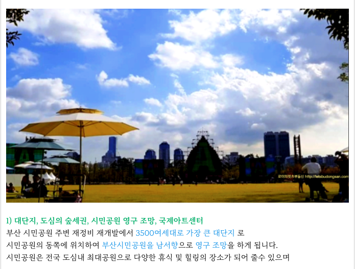 도심내 최대 공원인 부산 시민공원을 품고 있는 1선으로 영구 조망이 가능하다는 가장 큰 장점과