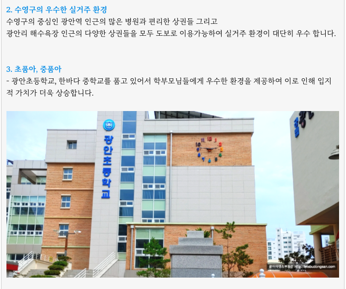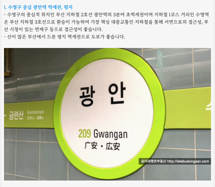 - 수영구 중심 광안동, 광안리 해수욕장, 주변시세 높은