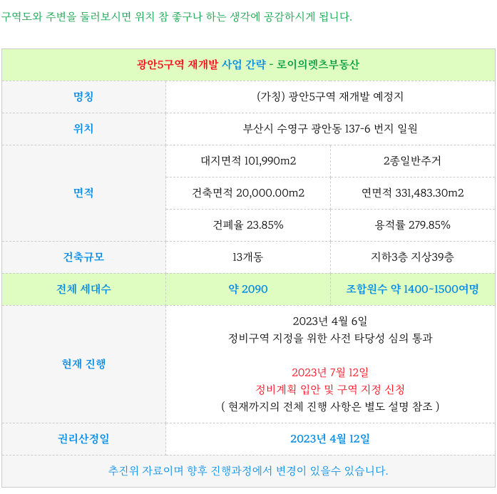 광안5구역 재개발의 현재까지의 진행상황 정리등 추가 정보는 아래 페이지를 참고 부탁드립니다.
