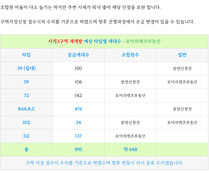 사직3구역 재개발 의 예상 타입별 세대수 입니다.