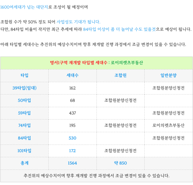 명서1구역 재개발 의 예상 타입별 세대수 입니다.