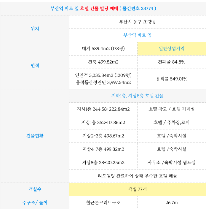 부산역 바로 옆 호텔 건물 빌딩 매매 물건 소개해 드리겠습니다.