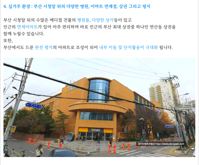 시청앞 뒤의 수많은 메디컬 건물의 병원들, 다양한 상가등이 있고 인근의 연제이마트가 있어 아주 편리하며