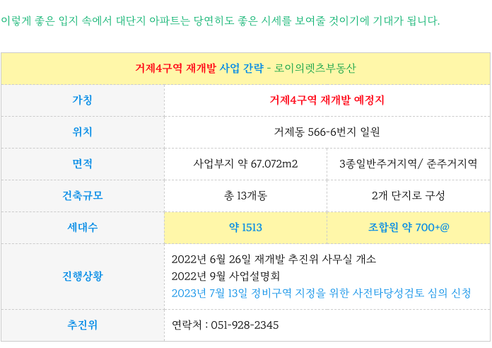 거제4구역 재개발 간략한 주요 특징을 다시한번 정리 하였습니다.