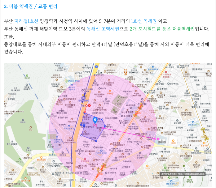 부산 지하철1호선 양정역과 시청역 사이에 있어 5~7분여 거리의 1호선 역세권 이고