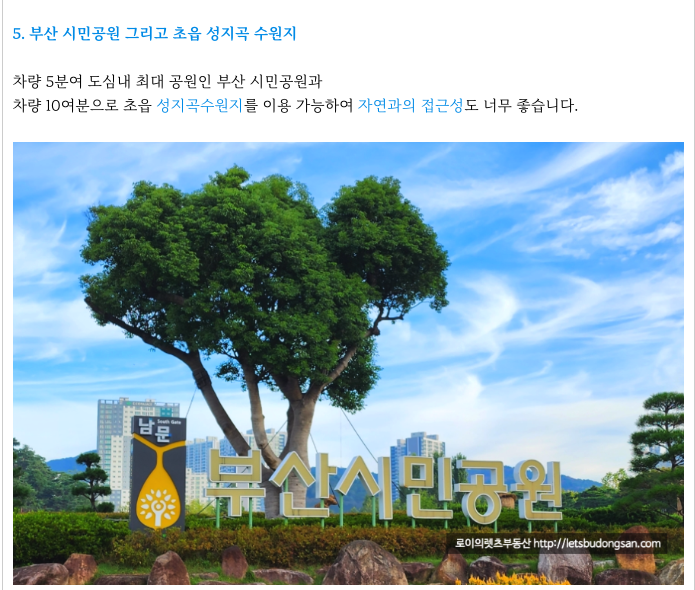 차량 10여분으로 초읍 성지곡수원지를 이용 가능하여 자연과의 접근성도 너무 좋습니다.