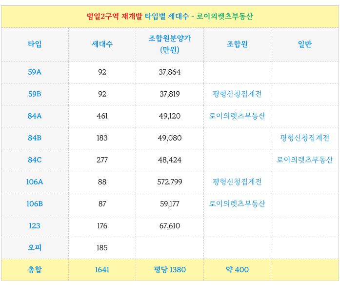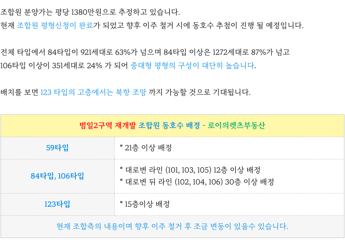 범일2구역 재개발의 현 타입별 세대수 및 조합원 동호수 예상 배정 소개해 드립니다.