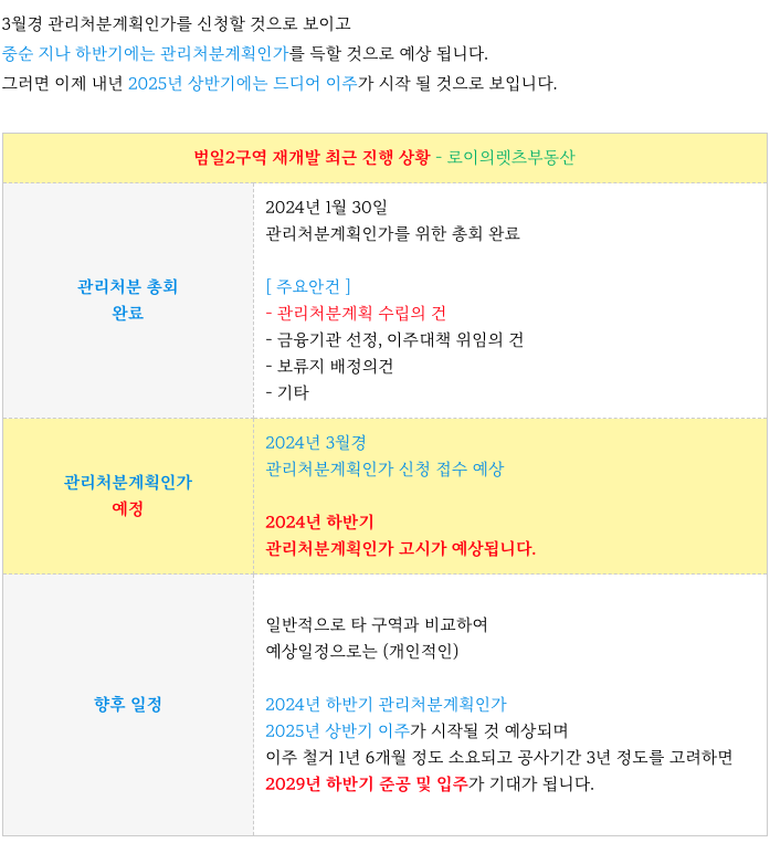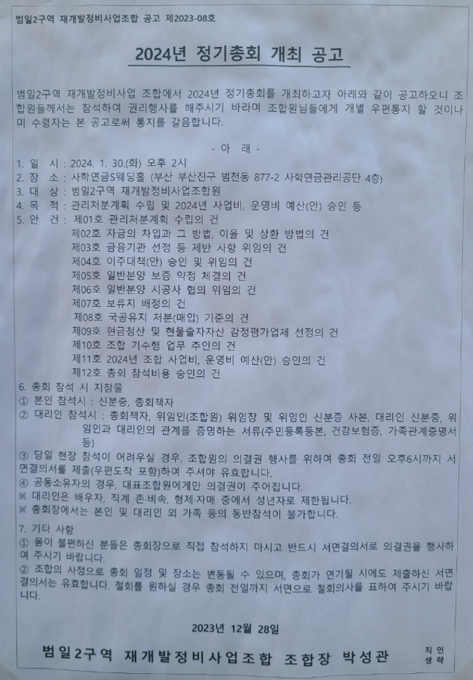 범일2구역 재개발은 2024년 1월 30일 관리처분계획인가 총회를 마무리 하였습니다.
