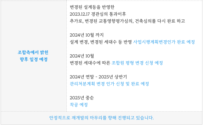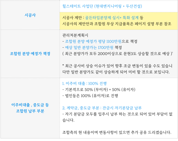 - 조합원 자기 분담금 100% 입주시 납부, 이주비대출 100%, 골든타임분양 등