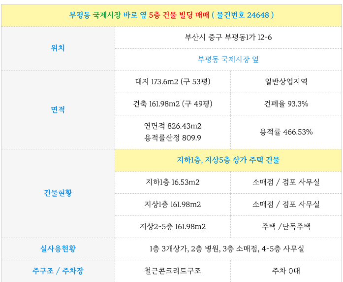 부산 중구 부평동 국제시장 바로 옆 5층 건물 빌딩 매매