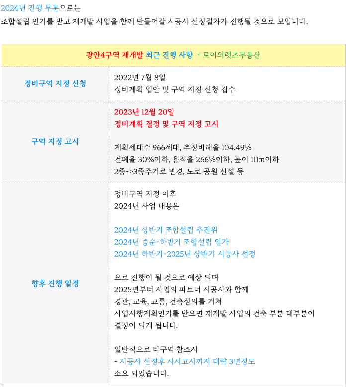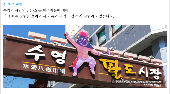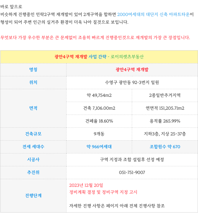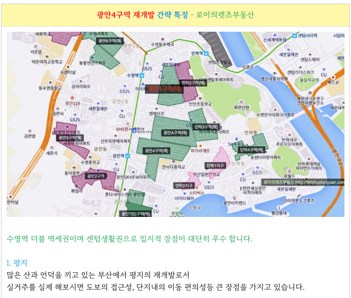 수영역 역세권 광안4구역 재개발 초기지만 현재까지의 진행 상황등 추가 정보는 아래 페이지를 참고 부탁드립니다.