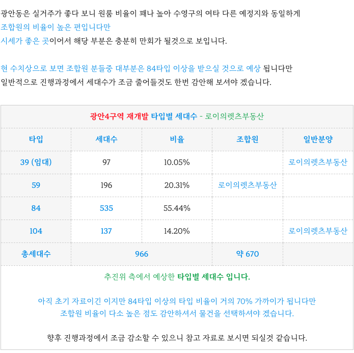 수영역 역세권 광안4구역 재개발 예상 타입별 세대수 입니다.