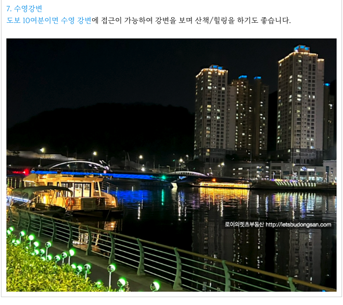 도보 10~20여분이면 수영 강변에 접근이 가능하여 강변을 보며 산책/힐링을 하기도 좋습니다.