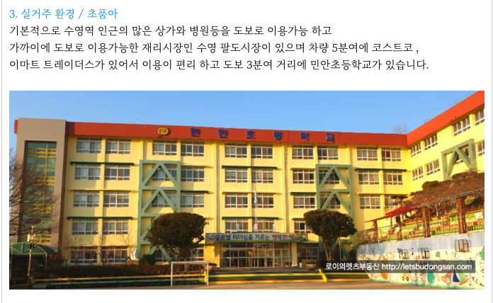 * 수영구 라는 시세 좋고 실거주 좋은 역세권에 위치한 곳이라는 장점이 가장 큽니다.
