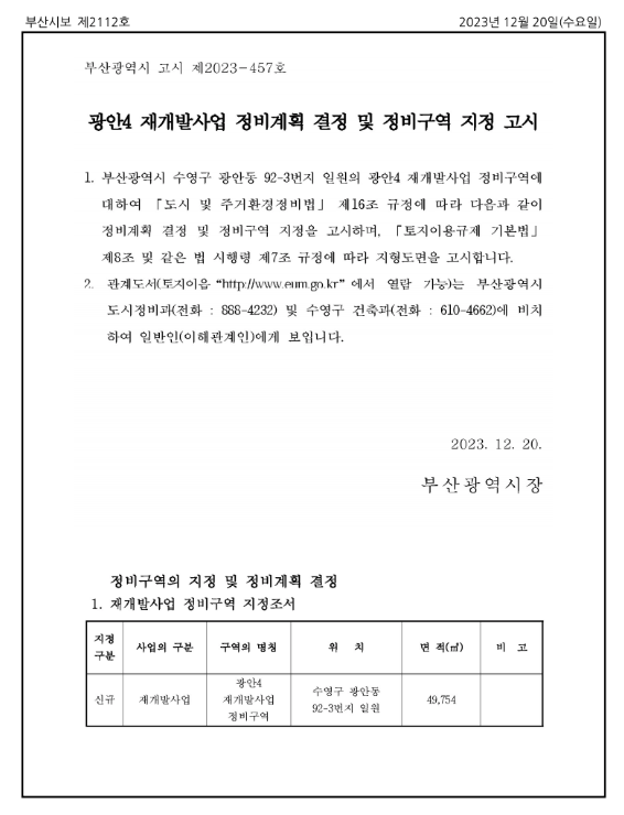광안4구역 재개발 은 구역 지정고시 이후 조합 설립을 준비중에 있습니다.