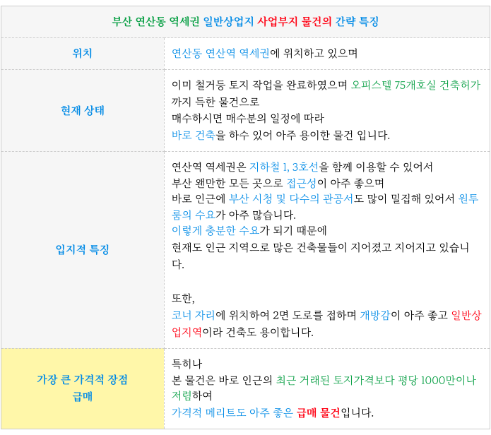 오늘 부산 연산동 역세권 일반상업지 사업부지 토지 매매 물건 정리 해드립니다.