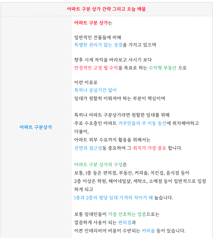 아파트 구분 상가의 특징에 대해 간략 설명 드리겠습니다.