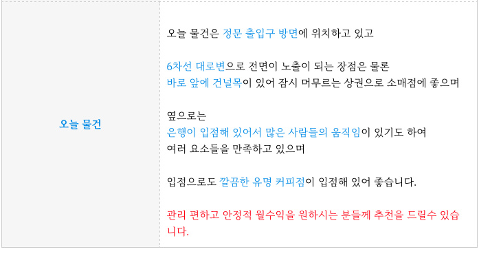 - 대로변에 전면, 바로 앞 건널목, 옆으로 은행 위치