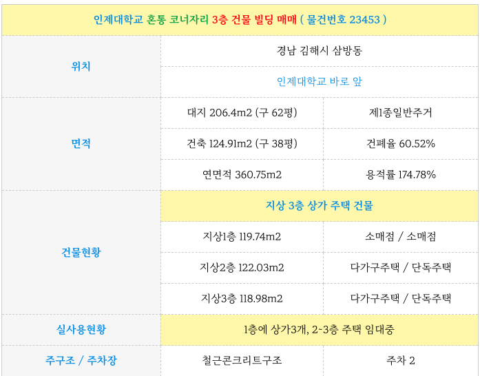 인제대학교 혼통 코너자리 3층 건물 빌딩 매매 물건 정보 소개해 드리겠습니다.