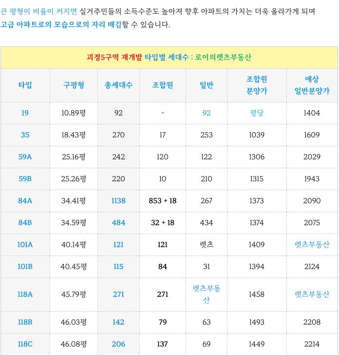 괴정5구역 재개발의 현재의 각 타입별 조합원 분양가와 세대수 입니다.