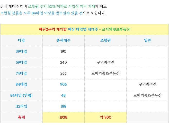 하단2구역 재개발 현 추진위의 예상 타입별 세대수 입니다.