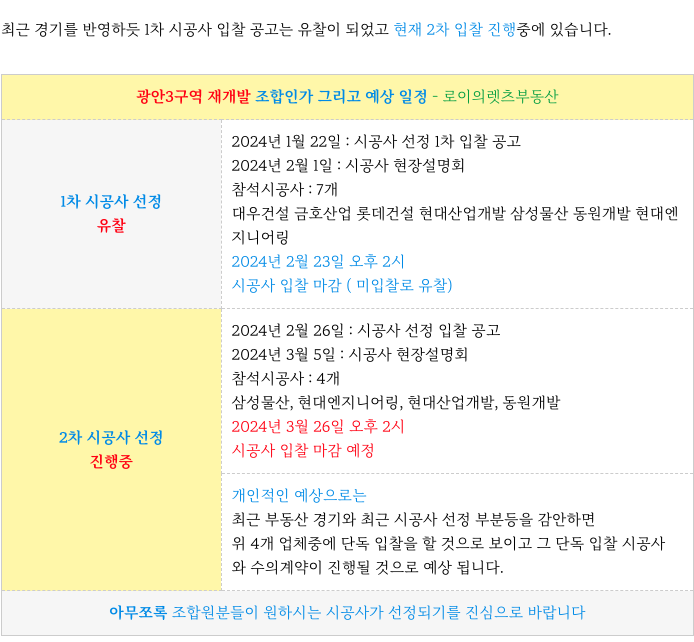 광안3구역 재개발은 조합설립 후 첫 절차로 시공사 선정 절차가 진행중에 있습니다.