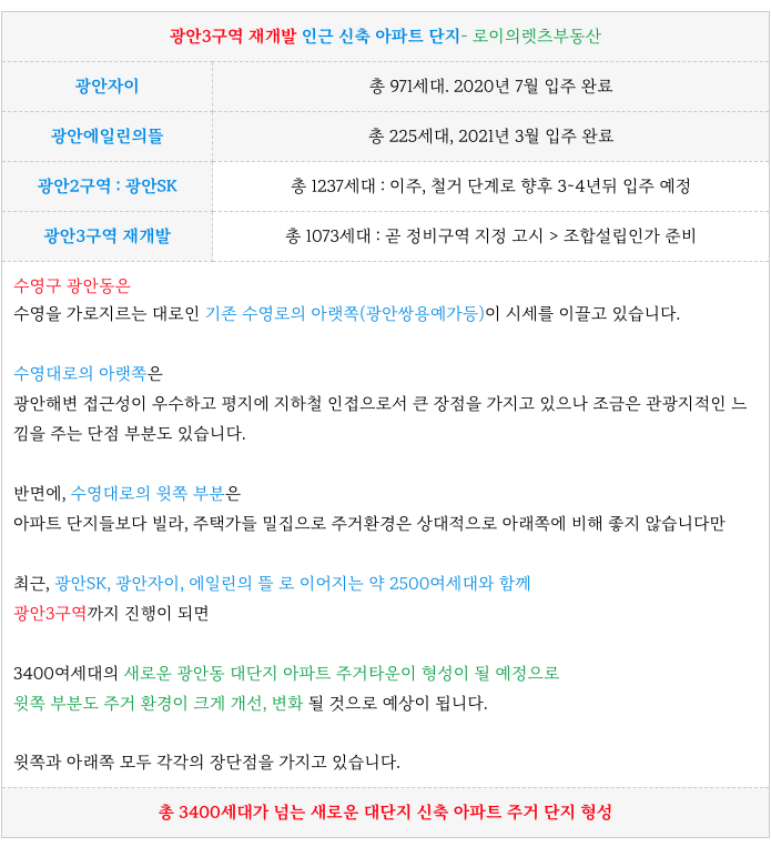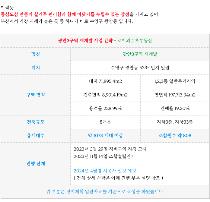 광안3구역 재개발 전반적인 특징 들을 다시 한번 간략히 정리하였습니다.