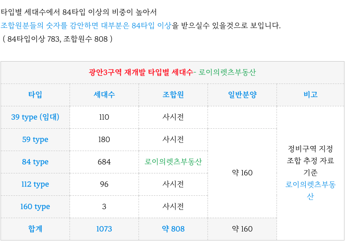 광안3구역 재개발은 현재 추진위 추정 타입별 세대수 입니다.