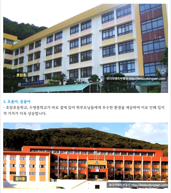 단지의 바로 곁으로 호암초, 수영중 등이 바로 접해 있어 초품아, 중품아로의 장점과